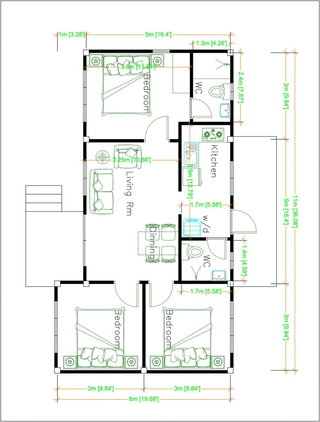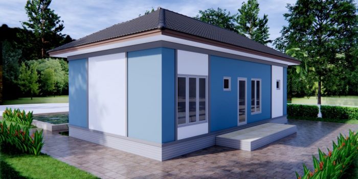 The plan offers an open porch leading to the living room. The exterior façade is simple but tidy and refined. The outside elevation shines with a sliding glass door and glass window panels with light grey aluminum frames. These windows are sufficient enough to supply the necessary light and air to ventilate the interior of the building.