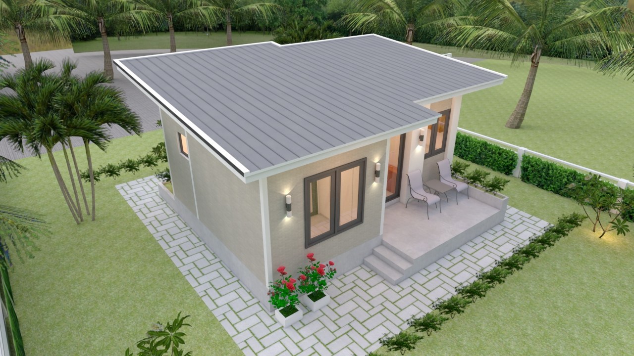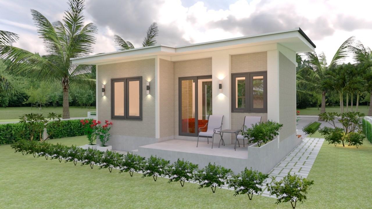 This small modern home has all the light, drama, and intimacy that you could want in a modest house plan. It features an elevated porch with brown flooring and a small canopy flat concrete roof. Additionally, it also has a hinged glass door and French-type windows allowing cross ventilation that keeps the interior at a pleasant level.