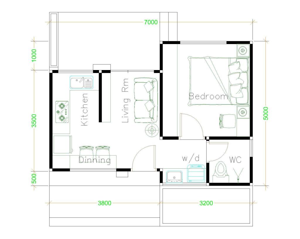 A small house plan, it is built in a lot that measures 7.0 x 5.0 meters that yields a usable building space of 35.0 sq. meters. The floor area is distributed to a porch, terrace, living room, dining room, kitchen, one bedroom, and one bathroom.