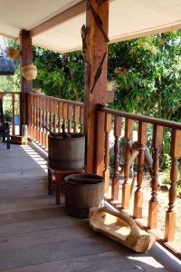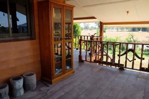 Traditional but stylish, this wooden house design in an agricultural land will bring back the memories of your childhood. As can be seen, the terrace is decorated with rare antique collections such as crockery and wooden farming tools of older days. Definitely, these provide both beauty and creating a spotlight for guests and visitors. There are a lot more of collections in the living hall.