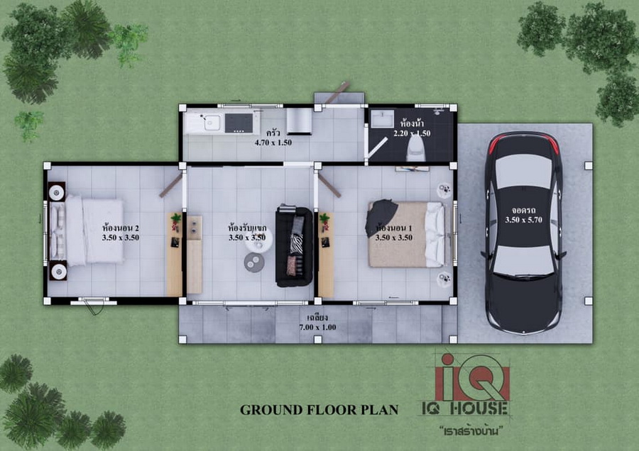 From the spacious frontage, you’ll travel through the terrace to access the living room through sliding glass doors. The living room is flanked by two bedrooms sitting on each side. The combined dining area and kitchen are in front of the living room, while the lone bathroom is just beside the kitchen. Meanwhile, the parking space with a reasonable space sits comfortably on the right side of the design.