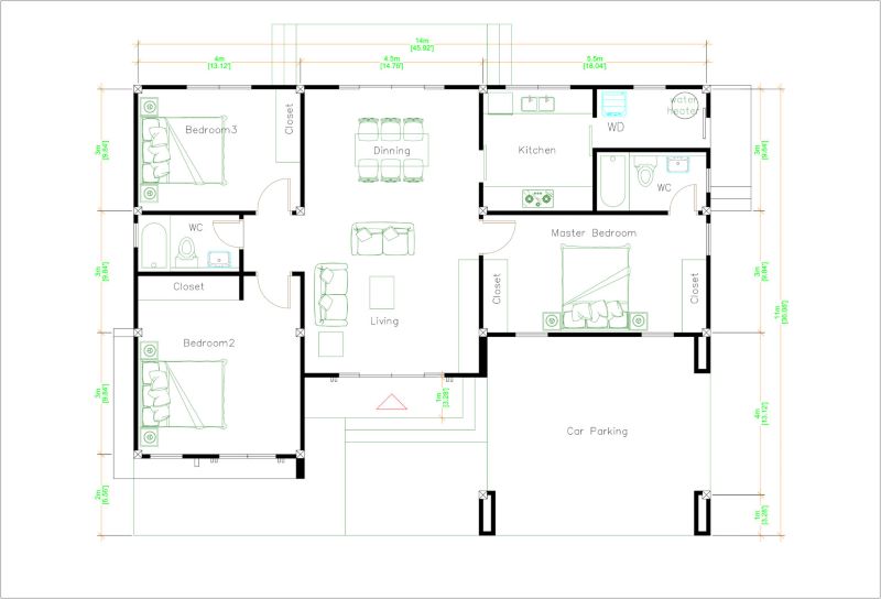 This home plan features great spaces with plenty of natural daylight flooding the common areas of the home. The great inner space is accessible from the terrace through the front glass door. Along your journey, you will observe the open plan for the living spaces in a triangular layout. The dining room sits between the living room in front and the kitchen on its right. Moreover, the flow of the space generates an easy enjoyable lifestyle with a light-filled master suite, positioned at the right front of the plan, that features a private ensuite and generous walk-in robe. Meanwhile, the secondary bedrooms and bathroom occupy the two dedicated corners on the left of the living room.
