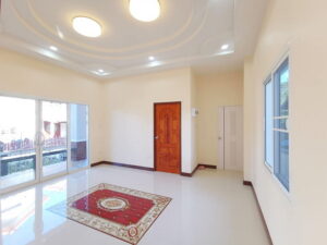 The gorgeous verandah ushers you to access the inner spaces through glass doors. The ambiance in the interior is enhanced by the open plan concept and glass window panels surrounding the house. Also, the tidy interior focuses on beauty and grace and looks elegant in a uniform shade of beige from the floor, interior walls to ceilings.