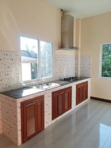 The kitchen has a decent working size with airy windows. The space is equipped with marble tiles and cabinets that provide great convenience.