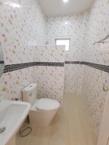 Meanwhile, the grace of the great living room extends to the bathroom which looks impressive with floral-designed wall tiles. The ambiance inside is refreshing.