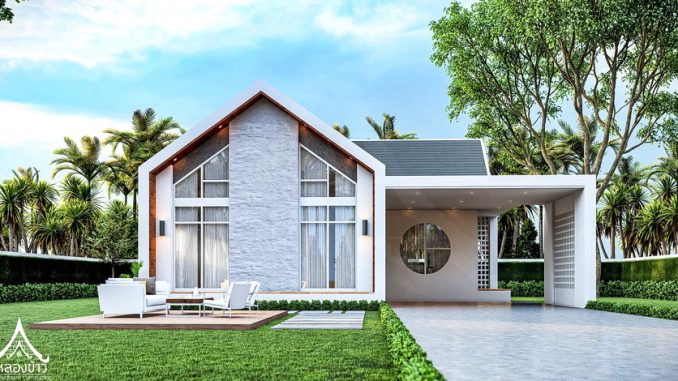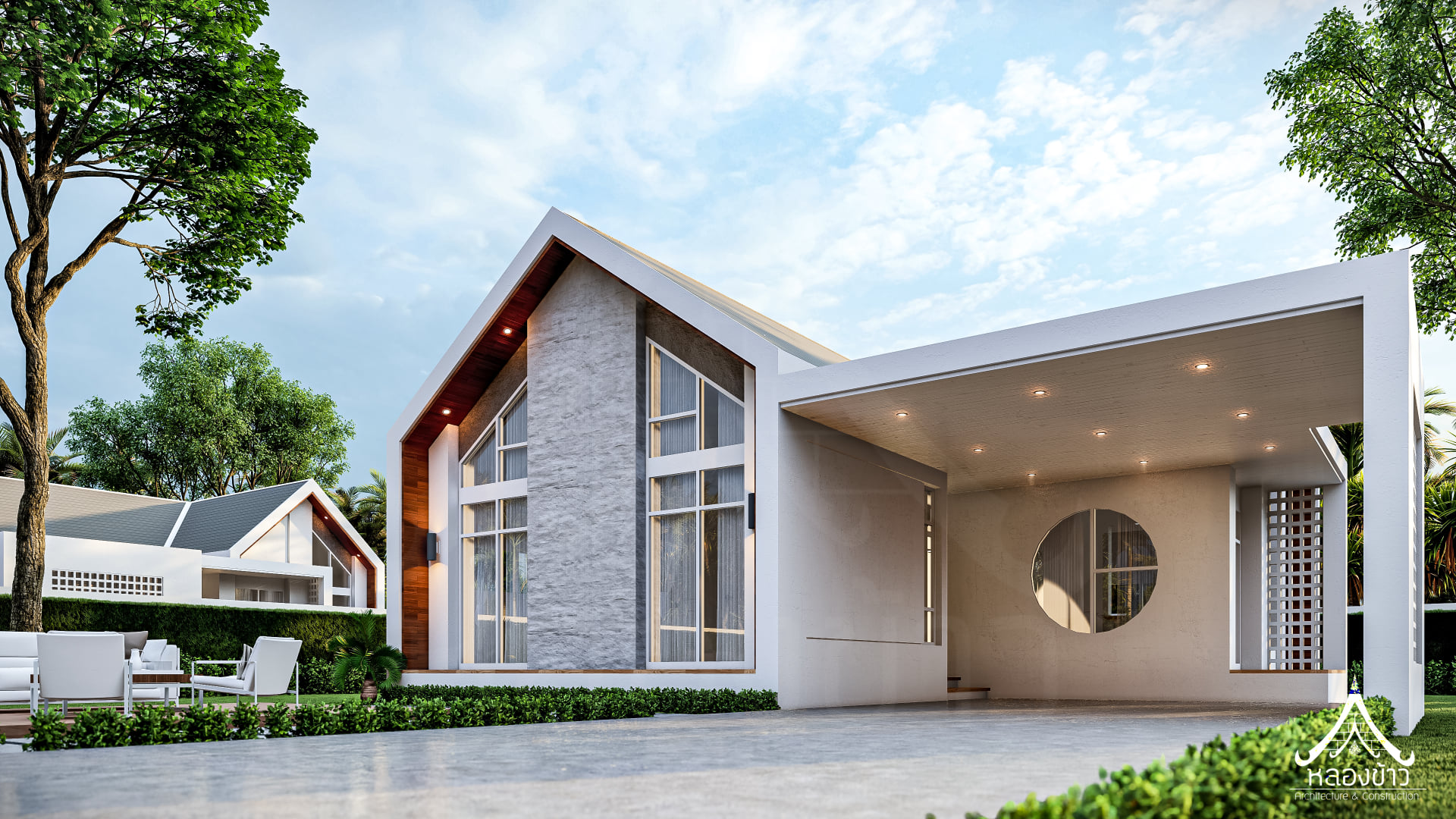 This modern home design also features a graceful and inviting carport sitting comfortably on the right side. It looks prominent with a slotted external wall and a concrete flat roof. Meanwhile, one eye-catching feature is the cross gable roof assembly with grey tiles and brown gable. Its refined workmanship together with the spotless exterior walls in white mineral plaster finish defines finesse.