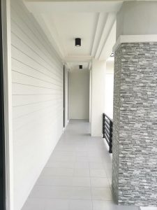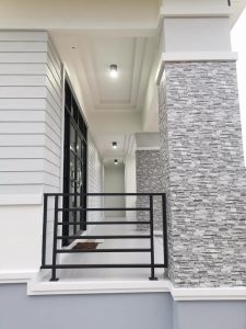 It headlines an elevated, long, and narrow balcony that emphasizes strength and style. Actually, the space will be more functional to serve as an extension of the inner spaces for relaxation. This space defines prominence with pillars accentuated by veneer stones in a silver-grey shade and secured by steel guardrails and an extended hip roof. Additionally, the clad wall with natural stones in a silver-grey tone between windows heightens the aesthetic value of the house.