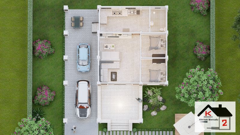 A design with a reasonable area, this house features a large balcony which is a perfect entrance to access the living room through the sliding glass doors. The living spaces in a free-flowing concept occupy the left portion of the layout. On the other hand, the right section hosts the private zone of two bedrooms and the lone bathroom that serves the entire family. Meanwhile, the spacious parking space is simply oozing with comfort and coziness.