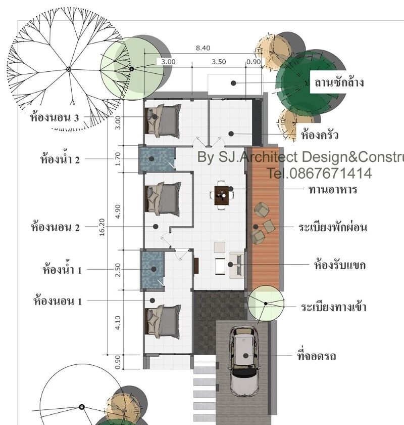 This design features a floor plan where space is used very efficiently. It stands in a lot of 8.4 x 16.2 meters dimension and yields a usable space of 107.0 q. meters excluding the carport and balcony. The floor layout spreads to a terrace, balcony living room, dining room, kitchen, three bedrooms, two bathrooms, and a carport.