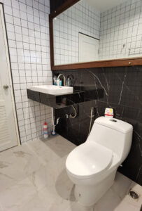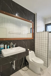 The elegance of the great room extends to the bathroom. It looks graceful in materials, fixtures and accessories, concepts, and layout. The entire space is pleasant and refreshing.