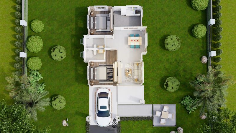 From the spacious frontage, you’ll travel to the terrace to access the living room through large glass doors. A straightforward design, the living spaces are on the right side of the plan in an open concept. Meanwhile, the left section hosts the private zone of two bedrooms. The master’s bedroom with a private ensuite sits in front, while the secondary bedroom is in the back corner.