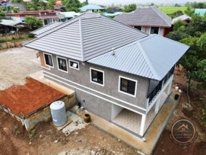 - an elevated verandah with marble tiles, steel guardrails, prominent columns with accents of veneer stones in brown tone and secured by an extended hip roof