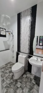 Meanwhile, the bathroom also exudes grace with grey tiles and cream walls. The space looks elegant and refreshing with the use of genuine fixtures and accessories.