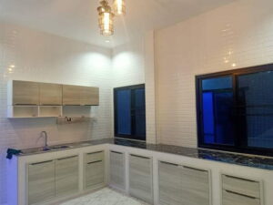 Additionally, the grace and elegance of the living room extends to the kitchen which explodes in cream and grey shades. The space is tidy and comfy with the right lights.