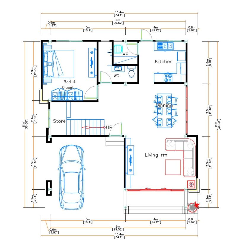 The ground floor hosts a porch, living room, dining room, kitchen, one bedroom, storage area, washing area, one bathroom, and carport. Your family will love this home with the living spaces in a free-flowing concept on the right side. In fact, the spacious great room is very comfortable with lots of natural light and air transmitting through the glass. With lots of comforts, the space is perfect for family entertainment. You will observe the bedroom and bathroom on the left back corner. Meanwhile, the inviting carport car finds its comfortable spot on the left side of the house.