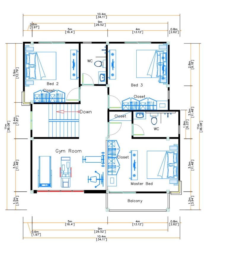 Along your journey, you will find the staircase on the left side that will bring you to the upper floor. The entire floor hosts the private zone of three bedrooms, a fitness gym, two bathrooms, and a balcony. As you set foot on top of the staircase, you will observe two secondary bedrooms occupying the back corners. The front section, on the other hand, hosts the master suite and the fitness gym. The master suite in the right corner is masterfully planned with a large full bath and walk-in closet. The secondary bedrooms also enjoy individual huge walk-in robes and other conveniences.