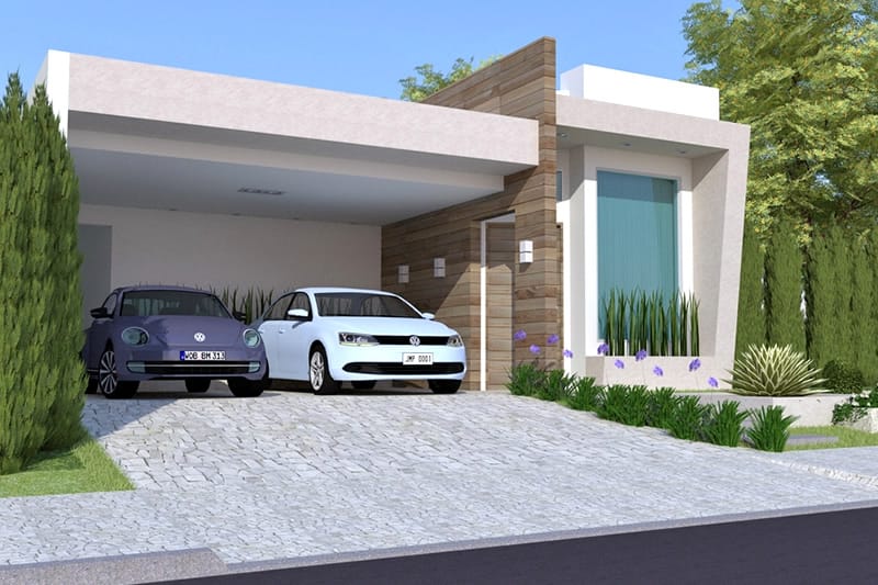 A green landscape welcomes the entrance with the carport on the left side. A door designed at 45° angle opens to the living room. The other rooms form a linear arrangement consisting of the dining room, kitchen, barbeque grill and gourmet area.