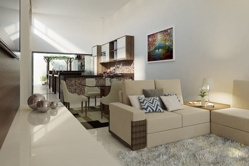 This photo shows the living room up to the end of the living spaces. The furniture and shade promote consistency and appeal inside the house.