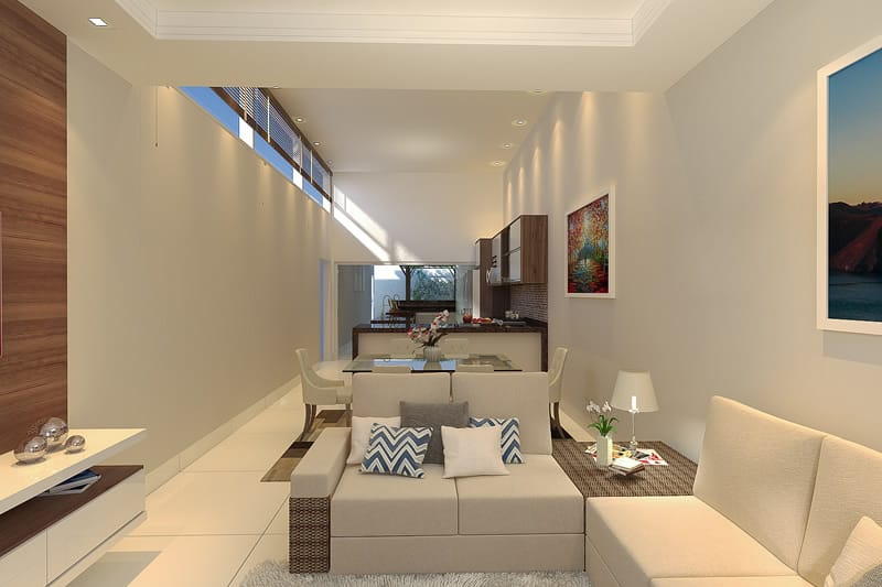 Rectangular lots have both the advantages and disadvantages as well. In this case, half section represents the living spaces while the sleeping zone covers the other half of the plan.