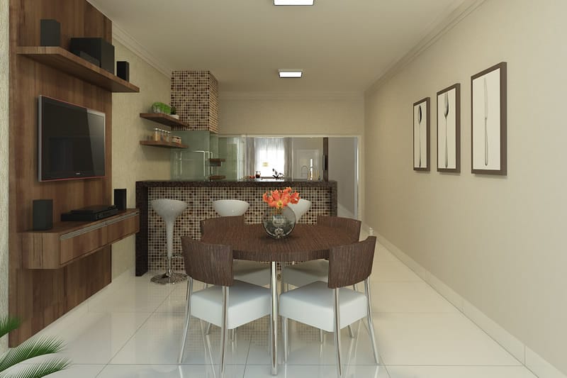 A simple dining room furnished with an average sized dining table, wall displays and fixed TV wall in brown color truly spark . The dining set establish a theme of uniformity with all other elements within the space.