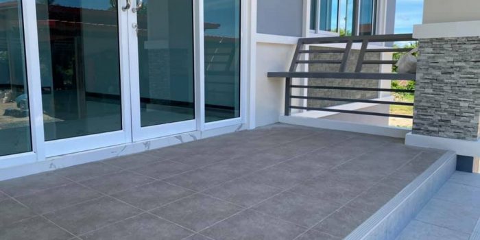 The unit has a hinged glass door in a blue shade tint in white aluminum frames, the size of which is impressive for keeping the inside well-ventilated. The porch with brown marble tiles and bench can serve as extension of family gathering place.