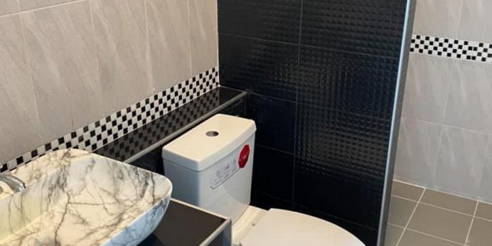 Meanwhile, the bathroom justifies elegance and consistency in a blend of black and grey wall tiles. On the other hand, the flooring complements the space in light brown tiles. Completing the bathroom are the fixtures and accessories with the best quality.
