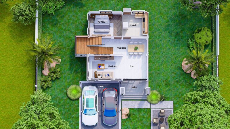 Meanwhile, the outdoor living space looks very cool and inviting with a beautiful garden and lush landscaping that creates a pleasant atmosphere. In fact, this area is perfect for entertaining guests and friends.