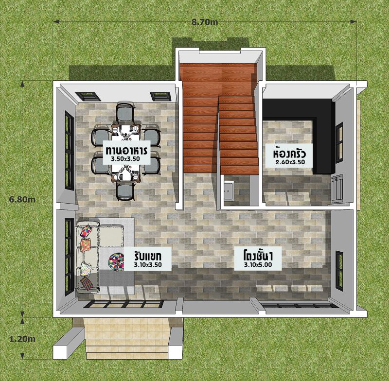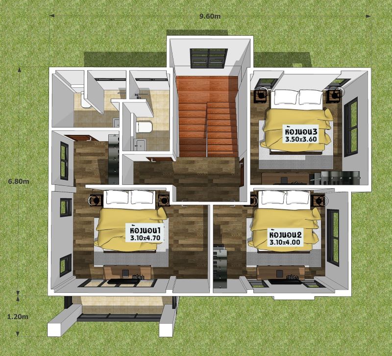 As you continue your journey, you will see the staircase at the middle back of the ground floor. The upper floor spreads to three bedrooms and two bathrooms, one attached and one detached. You will observe the master’s bedroom on the entire left section with a private ensuite and complete amenities. On the other hand, the secondary bedrooms occupy the two corners of the right part pf the plan. Additionally, there is a balcony on the upper floor that is accessible from the master’s bedroom. Actually, this is a great space in taking a glimpse of the outside panoramic view.