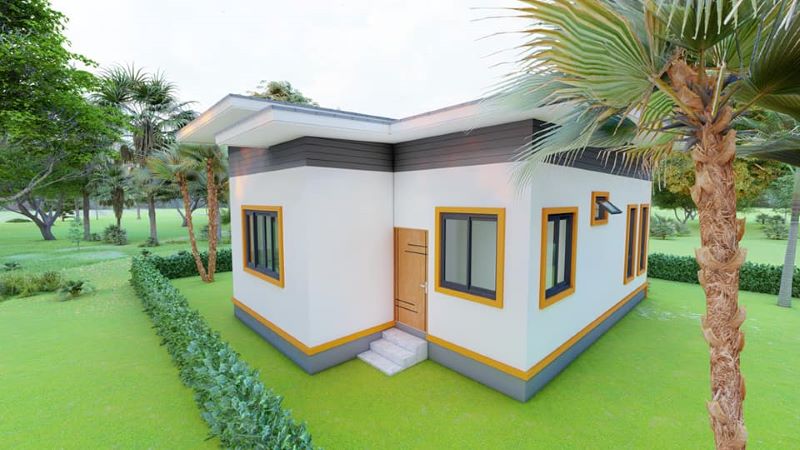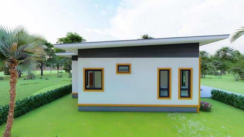 This bungalow house plan is aesthetically appealing with its exterior concepts. They enhance the stylish appearance and similarly, help reduce the heat inside because of their comforting features. A blend of versatile white and grey hues with an accent of bright orange in the elevation lends a striking but fascinating atmosphere.