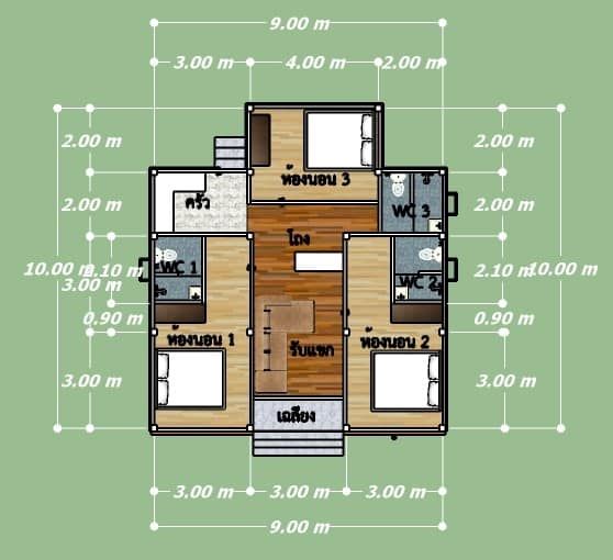 This modern home stands in a lot that measures 9.0 x 10.0 meters with a usable space of 90.0 sq. meters. Constructed in a raised elevation, the interior layout offers a porch, living room, dining area, kitchen, three bedrooms, and three bathrooms.
